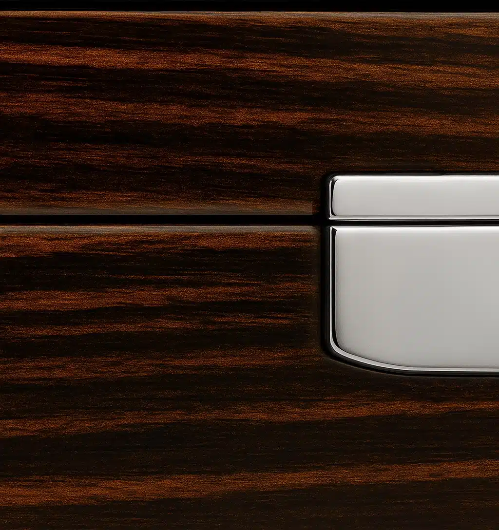 Matériaux : bois précieux, vernis soyeux, intérieur doux anti-rayures.